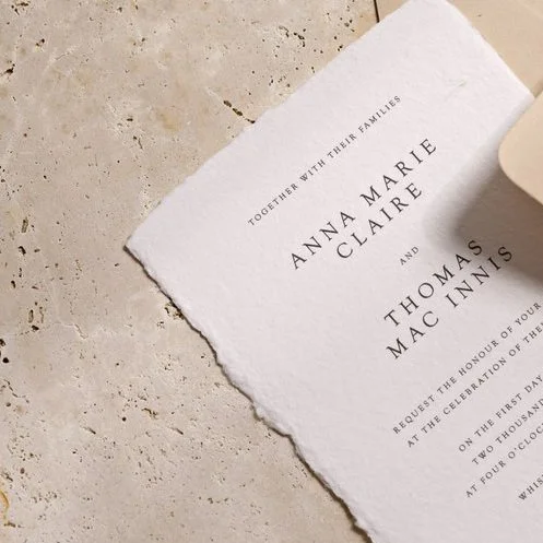 Sheet of paper, made individually by hand, using a mould and deckle. Handmade paper is absolutely beautiful and timeless, its soft deckled edge can really add detail and texture to an invitation suite. Pairs wonderfully with letterpress impression.